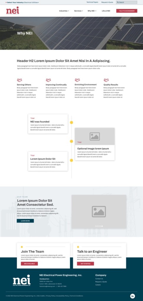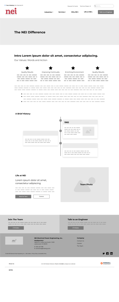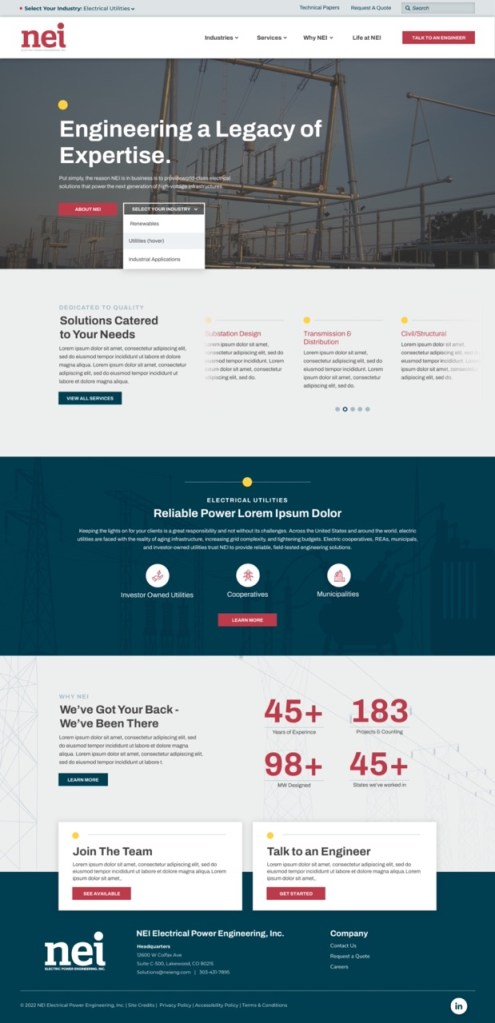 NEI serves many different industries in their line of work. Industries that juxtapose with one another and they needed a solution that would give each prospective client a unique experience with their website. The solution was a custom “select your industry” option that would allow the user to self identify and view unique content throughout the site depending on their industry. The functionality was simple, but built to be expanded over the years as their content and messaging grew.